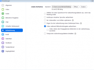 Vor Beginn eines Meetings sollten Sie prüfen, ob in Ihrer Desktop-Anwendung unter "Einstellungen" oben rechts im Menüpunkt "Aufzeichnung" der richtige Speicherort ausgewählt ist.