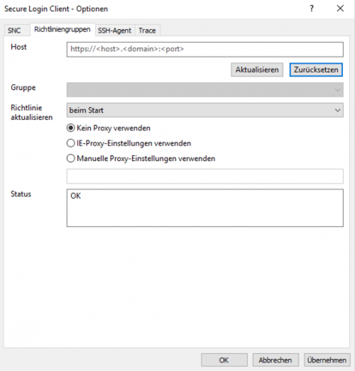 Unter dem Reiter Richtliniengruppen kann nun der alternative Secure Login Server sse.fernuni-hagen.de eingetragen werden (Aktualisieren und Übernehmen).
