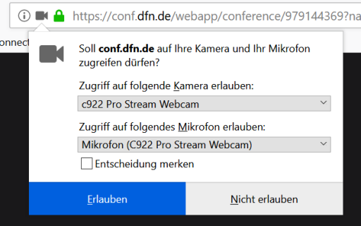 Wenn Sie den Pexip Videokonferenzraum zum ersten Mal betreten oder die Einstellungen bei Ihren vorherigen Nutzungen nicht gespeichert habe, werden Sie vom Browser aufgefordert den Zugriff auf die Webcam und das Mikrofon zu erlauben. Sollten Sie mehr als eine Webcam und/oder Mikrofon angeschlossen haben, wählen Sie hier bitte direkt die gewünschte aus, wenn Sie die Einstellungen für die nächste Nutzung speichern wollen, setzten Sie zusätzlich den Haken bei 'Entscheidung merken':