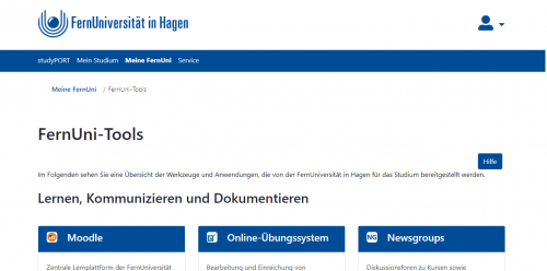 Die FernUni-Tools enthalten eine Übersicht der wichtigsten Anwendungen und Werkzeuge, die für das Studium an der FernUniversität bereitgestellt werden. Dabei handelt es sich um externe Anwendungen und Werkzeuge. Sie wurden in zwei Kategorien eingeteilt: Lernen, Kommunizieren und Dokumentieren und Organisatorisches.