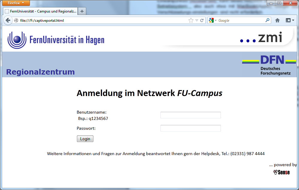 Anmeldung Nach erfolgter Verbindung (Herstellung der Funkverbindung über WLAN oder Einstecken des Kabels in die Dose) ist eine Legitimierung für den Zugang zum FuNET der FernUniversität und zum Internet erforderlich. Hierzu kann jeder Webbrowser auf dem Endgerät verwendet werden. Beim Aufruf einer Seite aus dem Internet erfolgt eine Umlenkung und es erscheint das Anmeldeportal: