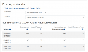 Wenn Sie alternativ die Aktivitäts-Statistiken aufrufen, erhalten Sie für eine ausgewählte Aktivität alle Zugriffszahlen eines Semesters. In der ersten Spalte steht dann die Kalenderwoche, die übrigen Spalten entsprechen der Darstellung oben.