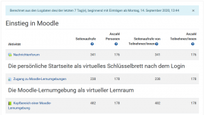 - Seitenaufrufe von Teilnehmer/innen: die Anzahl der Zugriffe durch Teilnehmer/innen. Seitenaufrufe durch Betreuer/innen (oder anderen Spezialrollen) werden hier nicht mitgezählt.