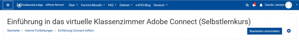 Um einen Kurs bearbeiten zu können, müssen Sie als Betreuer/-in des Kurses eingetragen sein. Auf der Startseite des Kurses klicken Sie rechts oben auf "Bearbeiten einschalten" oder auf "Bearbeiten einschalten" im Dropdown-Menü "Einstellungen".