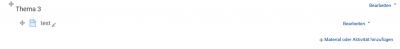 Bitte beachten Sie, dass sich je nach gewähltem Kursformat (änderbar in den Einstellungen unter Kursformat, z.B. Themenformat) sich die Ansicht auf der Startseite Ihres Kurses leicht abweichen kann. Die folgenden zur Veranschaulichung erstellten Bilder betrachten einen Kurs im Themenformat. Sobald die Bearbeitung aktiviert ist, kann die ganze Umgebung (hier Thema) bearbeitet werden oder einzelne Materialien oder Aktivität bearbeitet, entfernt oder hinzufügt werden. Um die Anzahl der Themen zu ändern, schauen Sie bitte unter "Einstellungen" und "Kursformat".