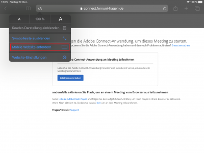 Ursache für die Schwierigkeiten ist eine neue Default-Einstellungen des Safari-Browsers unter iOS 13: Webseiten können normalerweise erkennen, von welchem Art von Gerät sie aufgerufen werden und dann zum Beispiel für Mobilgeräte und für Desktopgeräte unterschiedliche Varianten anzeigen. Seit dem Update auf iOS 13 fordert der Safari-Browser auf dem iPad nun aber standardmäßig alle Seiten als "Desktop"-Gerät an und verhindert damit Anzeige einer speziellen Mobilseite. Dadurch wird die mobile Webseite des Connectservers, mit der man dann die mobile Adobe Connect-App öffnen kann, nicht angezeigt. Sondern die normale Desktop-Version, die sich auf Mobilgeräten aber nicht öffnen lässt.
