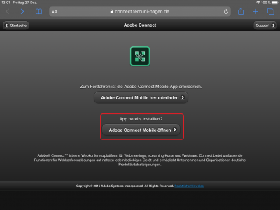 Version vom 27. Dezember 2019, 15:01 Uhr von Serwe (Diskussion | Beiträge) (Die Seite wurde neu angelegt: „Nach dem Update auf iOS 13 melden viele Nutzer*innen, dass der Zugang zu unseren Connecträumen trotz installierter Adobe Connect App nicht mehr funktioniert.…“)