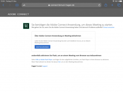 Nach dem Update auf iOS 13 melden viele Nutzer*innen, dass der Zugang zu unseren Connecträumen trotz installierter Adobe Connect App nicht mehr funktioniert. Wenn Sie es selbst ausprobieren wollen, können Sie jederzeit unseren Technikcheck-Raum aufrufen