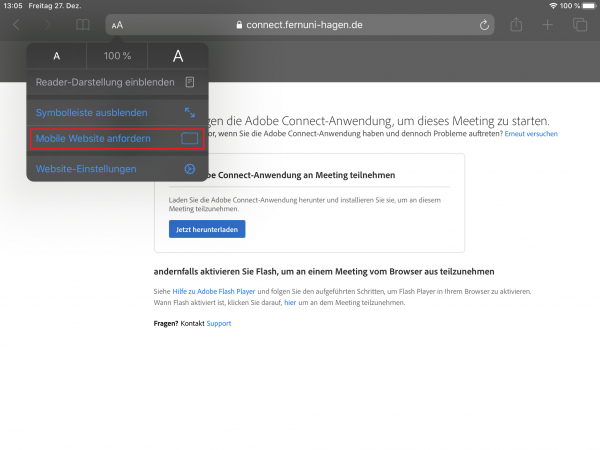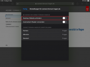 Ursache für die Schwierigkeiten ist eine neue Default-Einstellungen des Safari-Browsers unter iOS 13: Webseiten können normalerweise erkennen, von welchem Art von Gerät sie aufgerufen werden und dann zum Beispiel für Mobilgeräte und für Desktopgeräte unterschiedliche Varianten anzeigen. Seit dem Update auf iOS 13 fordert der Safari-Browser auf dem iPad nun aber standardmäßig alle Seiten als "Desktop"-Gerät an und verhindert damit Anzeige einer speziellen Mobilseite. Dadurch wird die mobile Webseite des Connectservers, mit der man dann die mobile Adobe Connect-App öffnen kann, nicht angezeigt. Sondern die normale Desktop-Version, die sich auf Mobilgeräten aber nicht öffnen lässt.