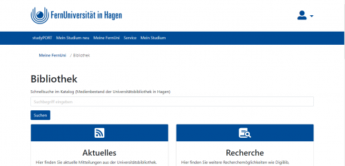 Ausgehend von der Startseite, befindet sich die Seite Bibliothek unter Meine FernUni oder direkt auf der Starseite als Anwendung mit dem Bücher-Symbol.